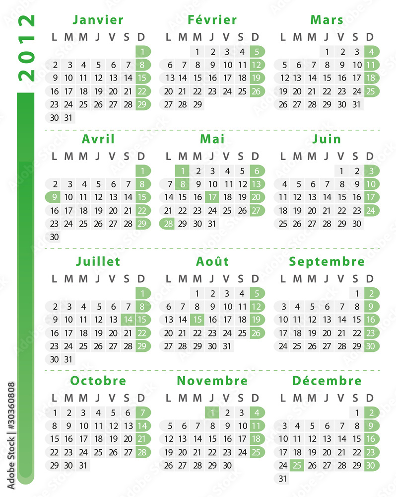 Calendrier 2012 français avec jours fériés, vecteur Stock Vector